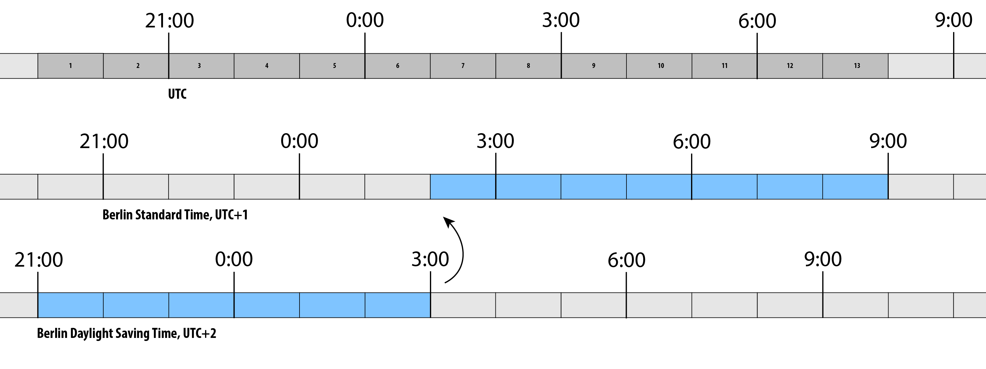 Now, instead of going to bed and setting an alarm, let’s consider a person who boards a bus in Berlin on Saturday at 9:00 PM (CEST) and arrives in Paris on Sunday at 9:00 AM (CET).